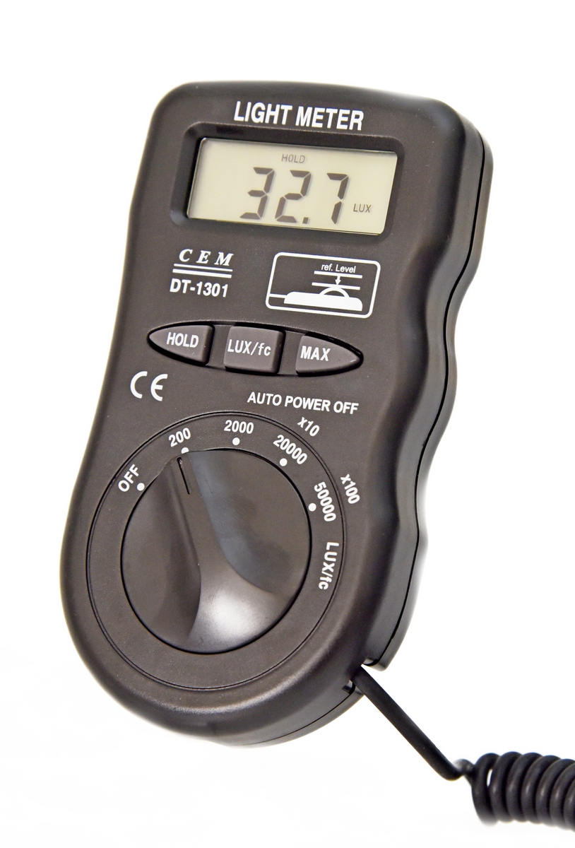 Люксметр DT-1301 имеет очень простое управление – вам нужно лишь выставить фотодетектор в поток света и посмотреть результат на жидкокристаллическом дисплее, оснащенном функцией автоматической подсветки и отображения уровня заряда батареи. Диапазон работы прибора составляет 0-50000 люкс/фут-кандел (1 фут-кандела=10,76 люкс). Имеется режим автоматического выбора диапазона измерений, режим удержания максимального значения и функция автоматического выключения питания через 15 минут бездействия.