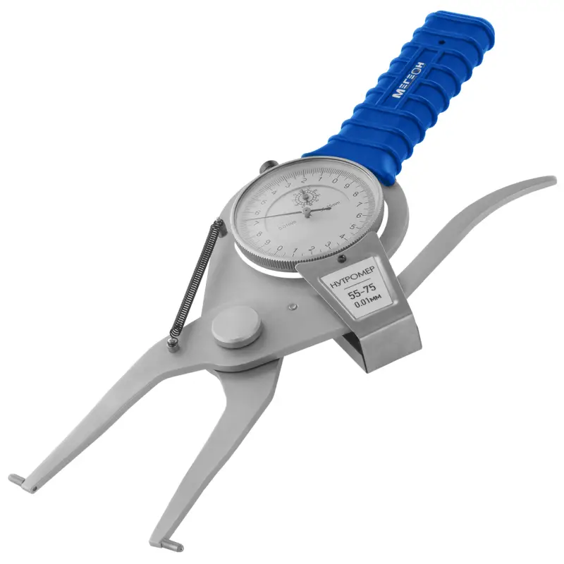 Нутромер микрометрический МЕГЕОН 80075 предназначен для измерения с высокой точностью внутренних размеров изделий относительным методом. В основе считывающего устройства применён индикатор часового типа с ценой деления 0,01 мм. Прибор имеет новую конструкцию ножничного типа, отличную от классических нутромеров. Здесь отсутствуют барабан, трехётка и стебель. К одному из важных преимуществ можно отнести быструю настройку изделия. Применение возможно в диапазоне диаметра отверстия 55...75 миллиметров. Обрезиненная ручка исключит проскальзывания прибора в руках, а наличие антикоррозийного покрытия на элементах конструкции предотвратит повреждение прибора ржавчиной при попадании нежелательной влаги и увеличивает срок эксплуатации. Для настройки ноля требуется установочная скоба 55 мм (приобретается отдельно).